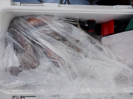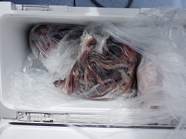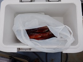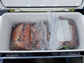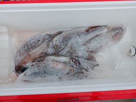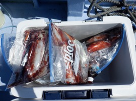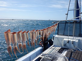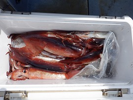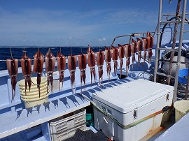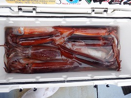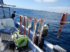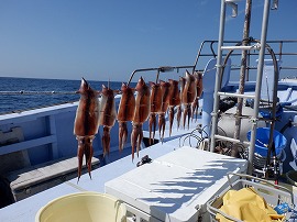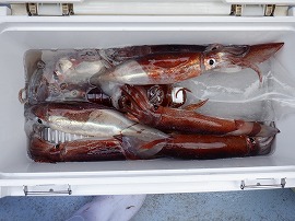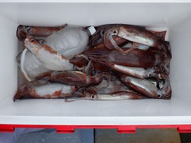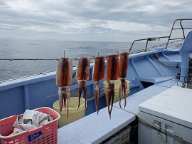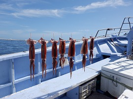 スルメイカ・祭日もお客さん1名で出船。灯台沖の水深140m~160m潮型は悪かったですが一人なのでやれ始めは大中型特大スルメイカが混じりで1杯づつですが割とすぐに乗って来ていい感じ◎その後はたま~に型程度の乗りお客さん船酔い気味に成りお気遣いも頂きお土産が出来たので帰りましょうよ!と9時半に早上がりしました。お客さん5本ブランコ仕掛けで12杯船長は直結で今日もバラシ多数も17ゲットしました。明日は午前スルメイカ釣り午後はダメ元で太サビキのハモノ狙いで出船をしますご予約をお待ちしています。