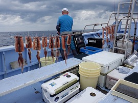 スルメイカ・灯台沖の水深170m~200mシケ後に出たら反応が少なく始めはウロウロ深い方に回ったら大中型スルメイカがブランコ仕掛けの人に乗って来ましたがにわか直結組は❓なのでブランコに変えてもらったら誰かにたま~に型が出る程度の乗りで一人だけ0点❓❓他の人達は3杯❓~12杯二番手10杯の釣果でした。明日もスルメイカ釣りで出船をしますご予約をお待ちしています◎