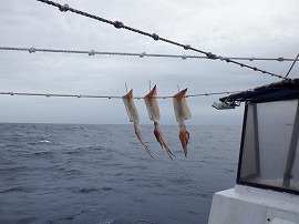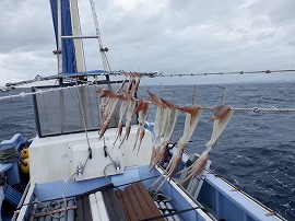 スルメイカ・ホテル出し~灯台沖の水深140m~160mまた水温が下がって濁り潮に成って居て始めは反応が少なく何回かやって見ましたが型が出ず灯台沖へ移動。二枚潮で潮型がイマイチ悪く時々オマツリも有りましたが大中型特大スルメイカが混じりでポツリポツリ乗っていい感じでしたが後半は水温が上がって澄み潮に変わったらサバが元気に成り数を延ばせずも一人6杯~18杯女性)の釣果でした。明日は今の所出船検討中です。