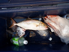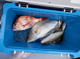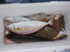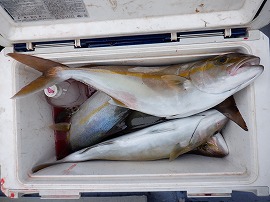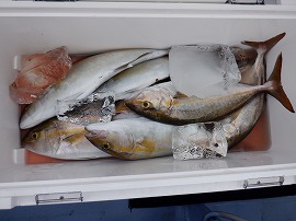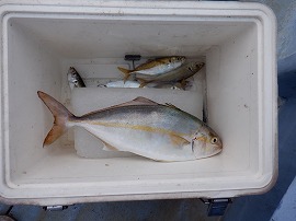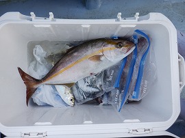 太サビキのハモノ狙い・強風予報だったので急きょ近場の釣物に変更。お客さん1名で勝浦湾内の水深12m~18m始めはエサ反応に当らずしばらくウロウロ。ようやく小さなアジ反応に当り投入してもらったらアジが当りすぐにハモノの当りが来ましたが巻き上げ途中で仕掛けが切れてバレてしまいましたが立て続けてカンパチが当りいい感じ◎その後はあちこちやってたま~にカンパチが当りお気使いを頂き船長十分なので上がって下さいよ!と9時過ぎに早上がりしました。カンパチ1.0kg1.7kg7匹ゲットでしたアジは少し。明日も風が強まる予報なのでイカは止めて近場の太サビキのハモノ狙いで出船を予定して居ますご予約をお待ちしています◎