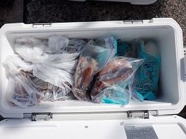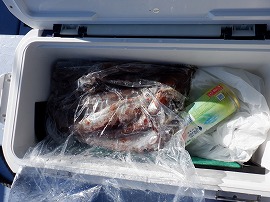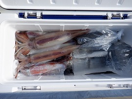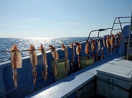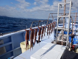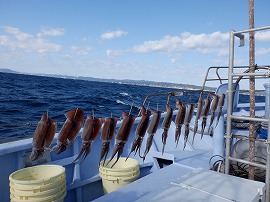 スルメイカ・海中公園沖の水深160m~230m始め北風が強く釣り辛かったですが大中型スルメイカが1杯づつポツリポツリ乗っていい感じでしたが後半は風も弱まりこれからと思いましたが流れがわずかに成ったせいか?渋く成りほんの型が出た程度で一人2杯❓~12杯の釣果でした。明日はナギ予報でスルメイカ釣りで出船をしますご予約をお待ちしています◎