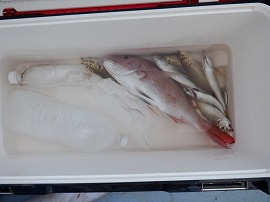 午前スルメイカ午後太サビキのハモノ狙い・朝は土曜日もお客さん2名で出船。ホテル出しの水深145m~175m二人共にブランコ仕掛けでやり始めは大中型スルメイカがポツリポツリ乗って早々に0点無しに◎途中からは?の差が出て5杯❓21杯の釣果でした。水温26.8℃ 小雨 北風3~6m 波1.7m すみ 込み真潮1.5N 午後船はダメ元で親娘一組で出船。勝浦湾内の水深12m~18m始めはウルメイワシの反応が有りましたがハモノ当たらずその後アジ&ウルメイワシ&小サバの反応の中をやって二人で4回当たってカンパチ1.3kg1匹ショウゴ1匹小型マダイ1匹良い引きでしたがバラシ1回の釣果でした。アジは少し。水温25.6℃ 小雨 北風6m 波0.5m 薄濁り 明日も午前スルメイカ午後太サビキのハモノ狙いで出船をしますご予約をお待ちしています◎