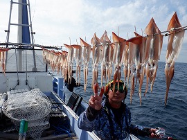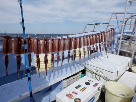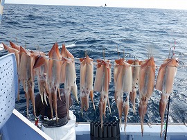 スルメイカ・海中公園沖の水深150m~175m朝一から潮型がイマイチでしたが大型スルメイカが1杯2杯で乗って来ていい感じもしばらくしたら水温が上がって上潮の流れが早く成り二枚潮になったので一流し一回投入でやり2点3点掛けも出ましたが一人だけ13杯他の人達は21杯~30杯(イカ釣り初挑戦で5本ブランコ)二番手28杯と皆さんお土産十分に成りました◎何と初挑戦者がトップでした!明日は貸切です月曜日はスルメイカ釣りで出船しますご予約をお待ちしています。