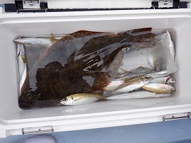 午前スルメイカ午後太サビキのハモノ狙い・朝は海中公園沖の水深150m~175m前半は風が弱く皆さん何故か?ブランコ仕掛けでやり反応に当てたら大型スルメイカが1杯2杯で乗って来て早々に0点無しに◎その後は直結をやったりブランコにしたり❓後半は風がやや強く成り差が出て一人17杯(いつも2~4杯しか取れない人が)~31杯と皆さんお土産に成りました◎明日もスルメイカ釣りで出船をします◎ご予約をお待ちしてます。水温21.1~21.4℃ 晴 西風弱~南西風8m 波1.5m やや澄み 真潮0.7N 午後船はダメ元で太サビキのハモノ狙いで出船。勝浦湾内の水深12m~18m アジ反応は無くも何か所かウルメイワシの反応が有りその中を流しましたが当りが少なく3名で5回当たってヒラメ1.2kg1枚4.5kg1枚イナダ2匹マダイ1kg1枚の釣果でした。水温20.1℃晴 南西風8m~3m 波0.8m やや澄み