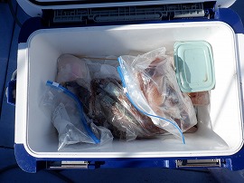 スルメイカ・海中公園沖の水深160m~200m風が弱くナギ日よりで始めは大中型スルメイカが1杯づつポツリポツリ乗っていい感じでしたが流れがわずかのせいか?後半はほんの型が出る程度で小型ヤリイカが少し混りを一人だけ4杯❓他の人達は同じ位づつで10杯前後でトップ13杯の釣果でした。