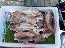 スルメイカ・ご夫婦一組だけで出船。海中公園沖の水深165m~200m風がやや強く釣り辛かったです(-.-)二人共に直結でやり始めは反応に当てると型が出ましたが8時頃から流れが早く成り二枚潮でしばらくはほんの型が出る程度でしたが後半から終盤はまた反応に当てると1杯づつで乗って来て終盤は2回3点掛けも出たりして大中型スルメイカを14杯18杯でお土産に成りました◎明日もスルメイカ釣りで出船をしますご予約をお待ちしています◎